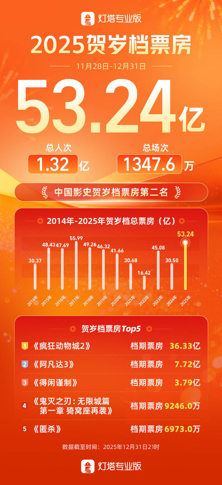 ![]() 据灯塔专科版,收场12月31日21时,2025贺岁档票房53.24亿,位列中国影史贺岁档票房第二,影片《随便动物城2》得回2025年贺岁档票房冠军,同期亦然中国影史贺岁档票房冠军! ![]() 来自淘票票媒体号:灯塔专科版开云「中国」Kaiyun官网登录入口 |