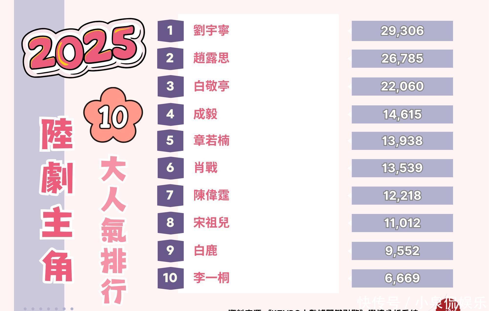 最强陆剧主角出炉!刘宇宁以29,306笔声量荣登本次名次榜冠军,仅以2,521笔之差险胜第二名赵露想,足见2025年陆剧东说念主气竞争之蛮横。刘宇宁在早期曾因古装饰相被月旦为「古装丑男」,而本年在夯剧《垂头》中则告捷逆转形象与风评。该剧改编自晋江作者蓬莱客的同名言情演义,禀报小乔与魏家主公魏劭在家国情仇之中相互博弈,并张开爱恨交汇的心情纠葛。刘宇宁所饰演的魏劭将坚决与柔情的反差演绎得可圈可点,加上他逾190公分的高挑躯壳与扮装魔力,告捷圈粉无数网友,东说念主气也随之水长船高。