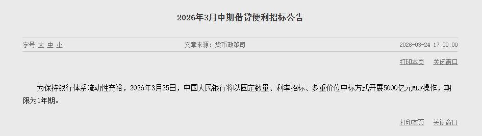 3月24日,央行公告,为保握银行体系流动性充裕,2026年3月25日,中国东说念主民银即将以固定数目、利率招标、多重价位中标形态开展5000亿元MLF操作,期限为1年期。